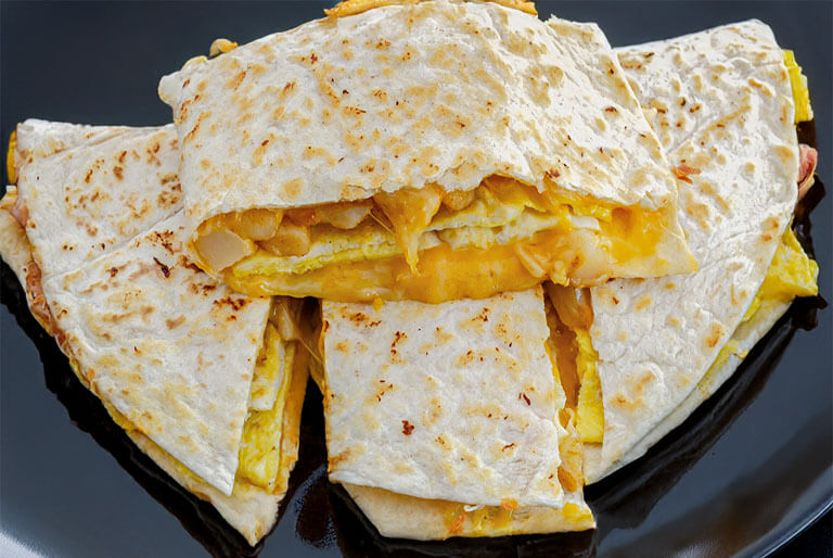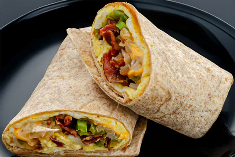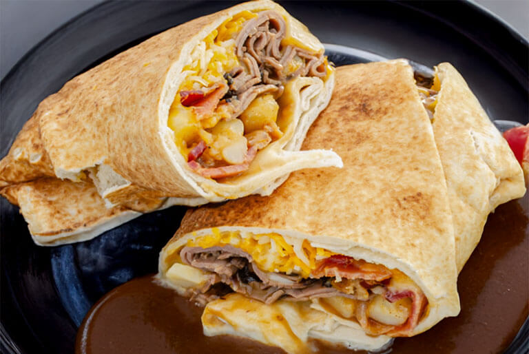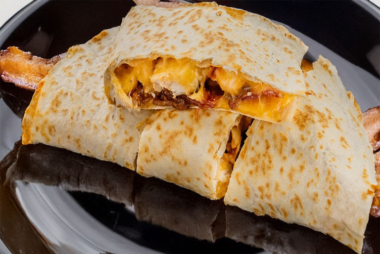 3 egg omelet, cajun home fries, your choice of bacon, sausage, pork roll, or ham, and melted cheddar 'n jack cheese folded and grilled in a flour tortilla.