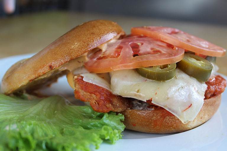Breaded and fried flounder tossed in cajun seasoning, crispy bacon, lettuce, and sliced tomatoes, topped with our homemade garlic 'n herb mayo and served on a toasted semolina roll.