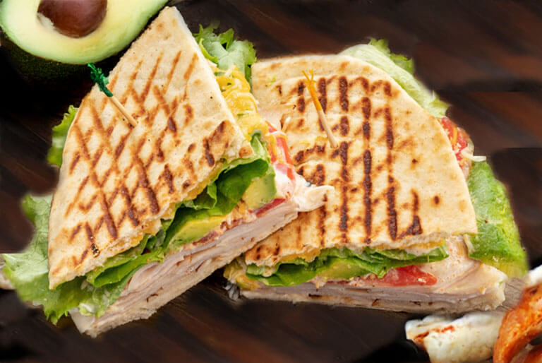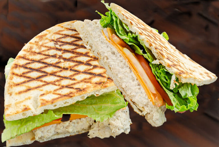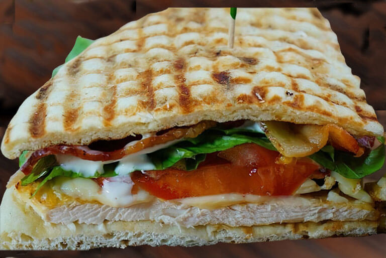 Grilled turkey, crispy bacon, red onions, green apple slices, and melted gruyere cheese topped with our homemade sun dried tomato mayo and griled on panini bread.