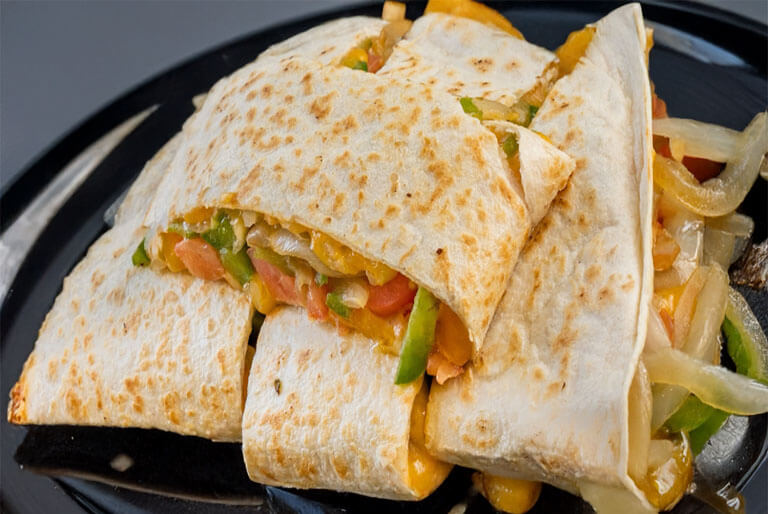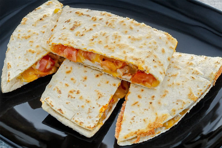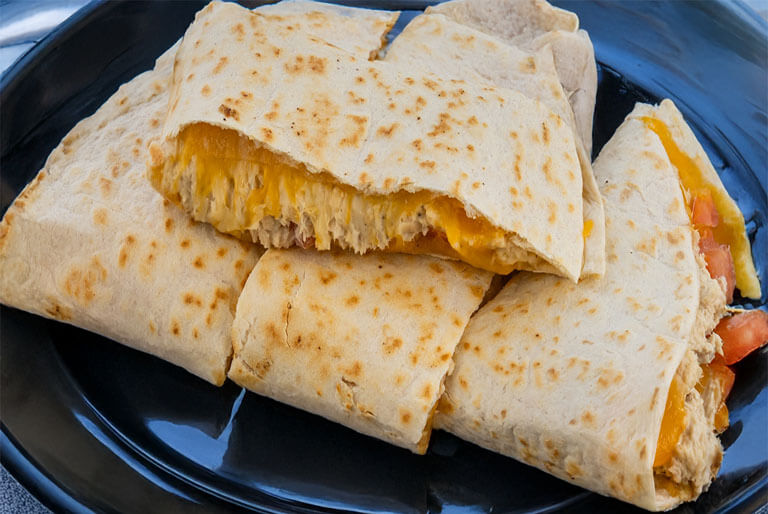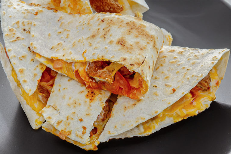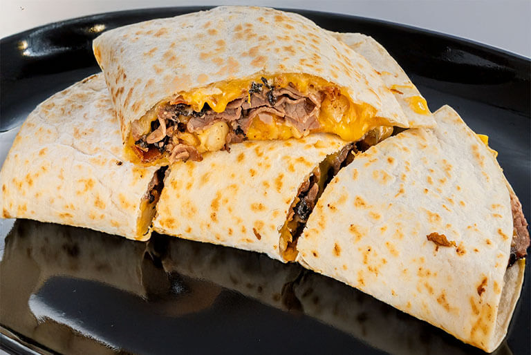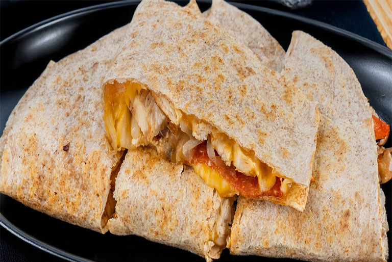 Diced grilled chicken breast, tomatoes, crispy bacon, melted cheddar 'n jack cheese, topped with BBQ sauce folded 'n grilled in a flour tortilla.