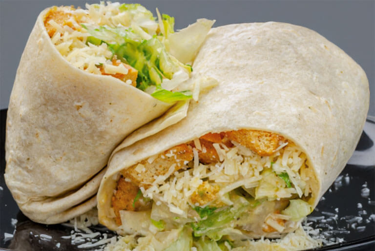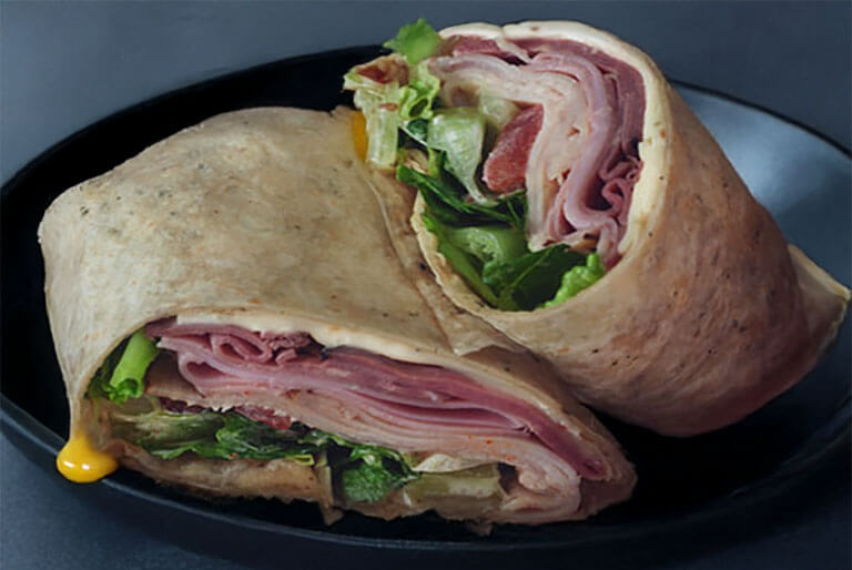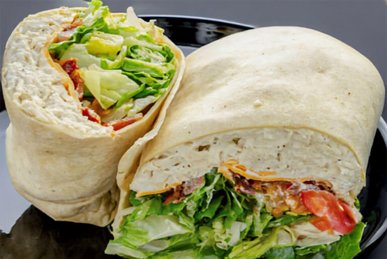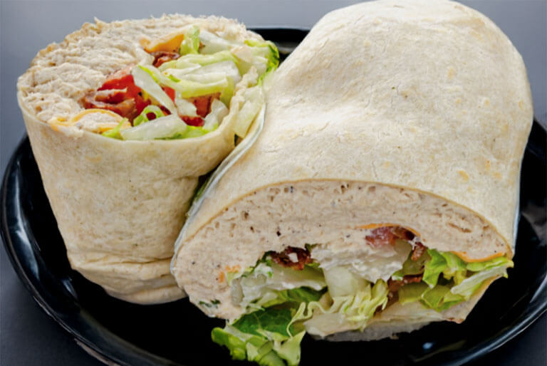 Swiss, pepperjack, and provolone cheese, lettuce, tomatoes, and your choice of dressing rolled in a garlic herb tortilla.