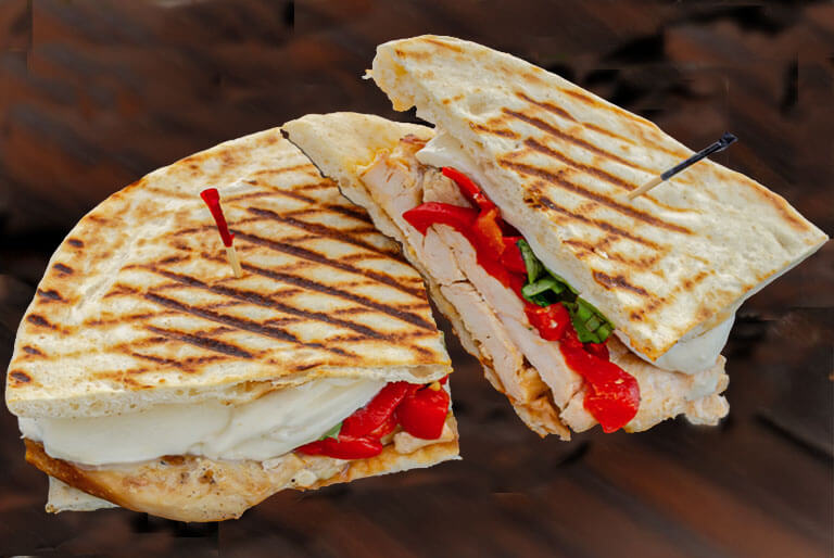 Grilled chicken breast, roasted red peppers, melted fresh mozzarella, and fresh basil topped with our homemmade balsmic wrapped in a fresh pita.