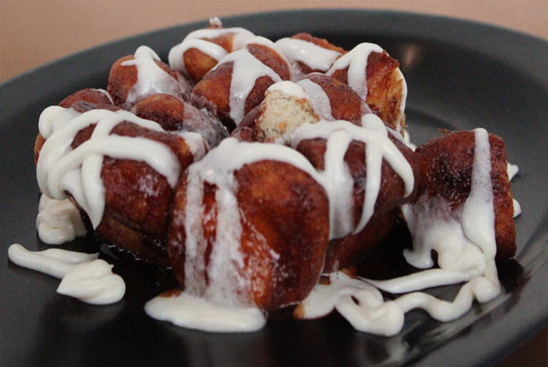 A childhood classic! Bite size pieces of sweet biscuits covered in a gooey cinnamon sauce and topped with vanilla icing