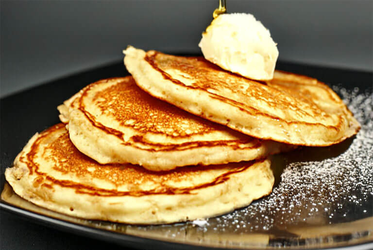 3 large, fluffy buttermilk pancakes served with butter and syrup.