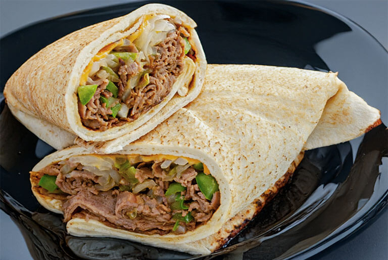 Grilled, thinly sliced and shredded top round steak, sautèed onions 'n peppers, and melted American cheese rolled in a fresh pita.