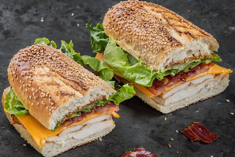 Grilled chicken breast, freshly sliced avocado, crispy bacon, tomatoes, egg, and Swiss