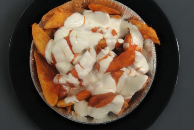 Popcorn chicken, seasoned potato wedges, lettuce and tomatoes topped with our homemmade buffalo sauce and chunky bleu cheese dressing rolled in a flour tortilla.