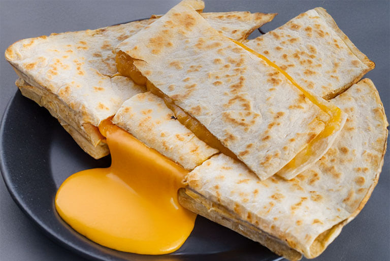 Diced grilled chicken breast, tomatoes, crispy bacon, melted cheddar 'n jack cheese, topped with BBQ sauce folded 'n grilled in a flour tortilla.