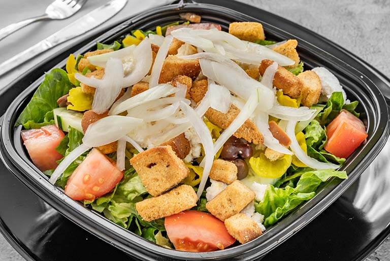 Feta cheese, Kalamata olives, tomatoes, cucumbers, hot peppers and croutons served over a bed of freshly chopped romaine and served wtih a side of homemade balsamic vinaigrette.