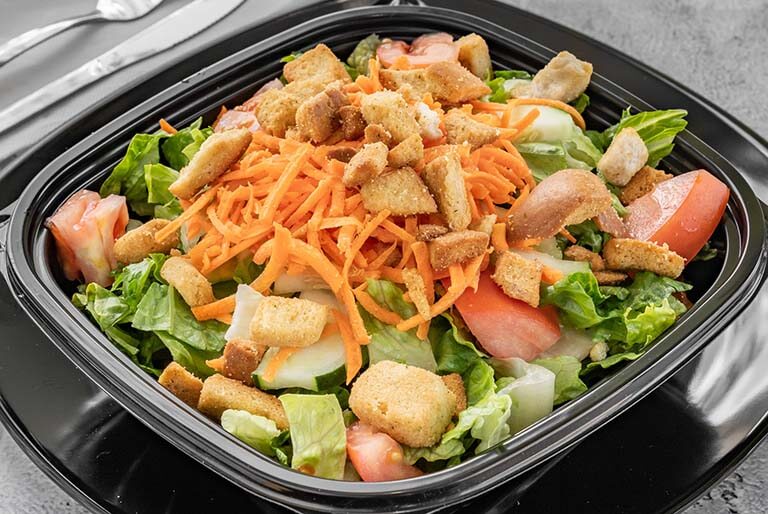 Tomatoes, carrots, cucumbers and croutons served over a bed of freshly chopped romaine and served with a side of homemade buttermilk ranch dressing.